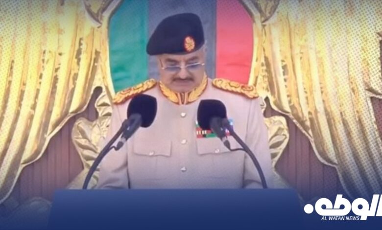 وختم المشير حفتر كلمته بدعوة كل الليبيين للاعتزاز بجيشهم الوطني، قائلاً: “ليبيا تستحق من أبنائها البذل والفداء لتبقى في مكانتها الإقليمية والدولية”. وأضاف: على كل ليبي أن يعتز بجيشه الوطني الذي يحمي الوطن ويدافع عنه بشجاعة مؤكدًا أن جيشنا واجه التحديات بإرادة حديدية لا تلين، وقادر على التصدي لكل المخاطر بحزم وقوة