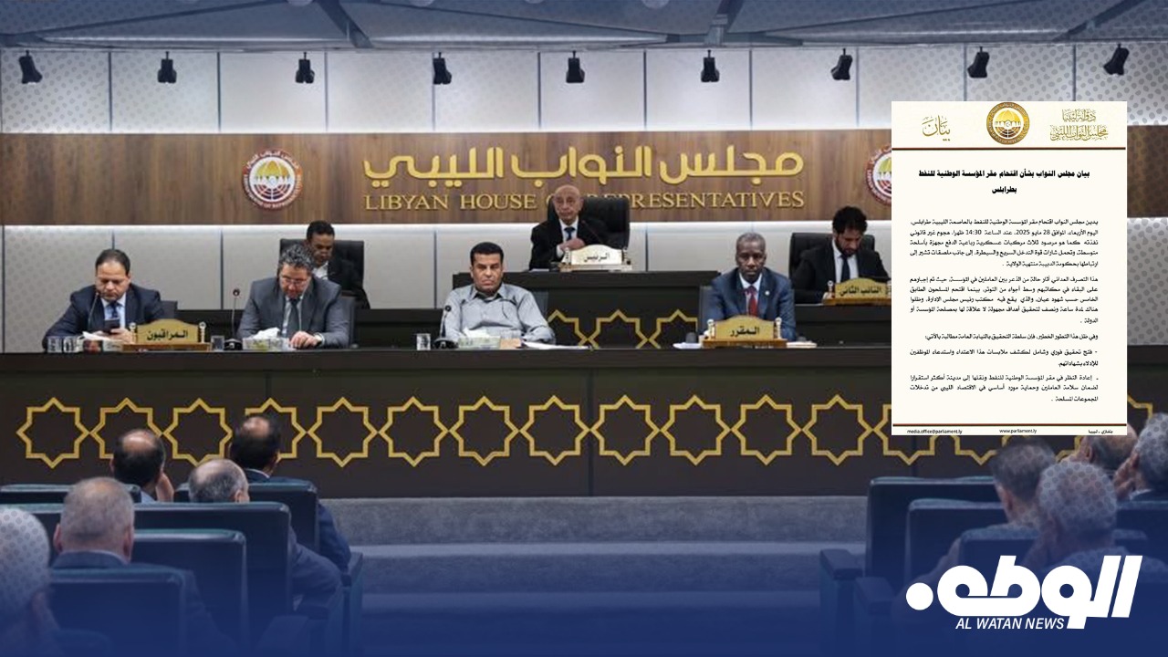 أدان مجلس النواب في بيان رسمي اقتحام مقر المؤسسة الوطنية للنفط بالعاصمة طرابلس من قبل ثلاث مركبات عسكرية رباعية الدفع مجهزة بأسلحة متوسطة وتحمل شارات قوة التدخل السريع والسيطرة، إضافةً إلى ملصقات تشير إلى ارتباطها بحكومة الدبيبة منتهية الولاية.