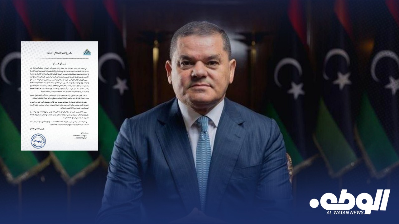 أصدر جهاز تنفيذ وإدارة مشروع النهر الصناعي من مقره الأصلي في بنغازي منذ تأسيسه بيانًا يؤكد في أن حكومة الدبيبة أوقفت الموارد المالية دون مبرر قانوني.