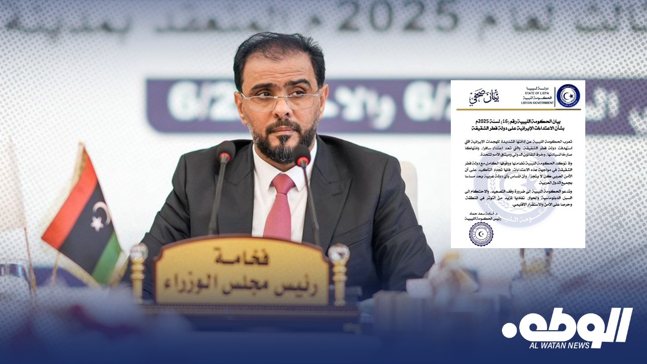 أعربت الحكومة الليبية عن إدانتها الشديدة للهجمات الإيرانية التي استهدفت دولة قطر الشقيقة، والتي تعد اعتداء سافرا، وانتهاكا صارخا لسيادتها، وخرقا للقانون الدولي وميثاق الأمم المتحدة.