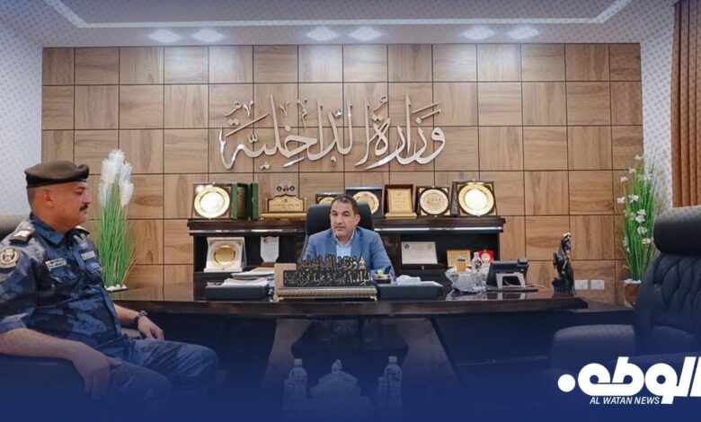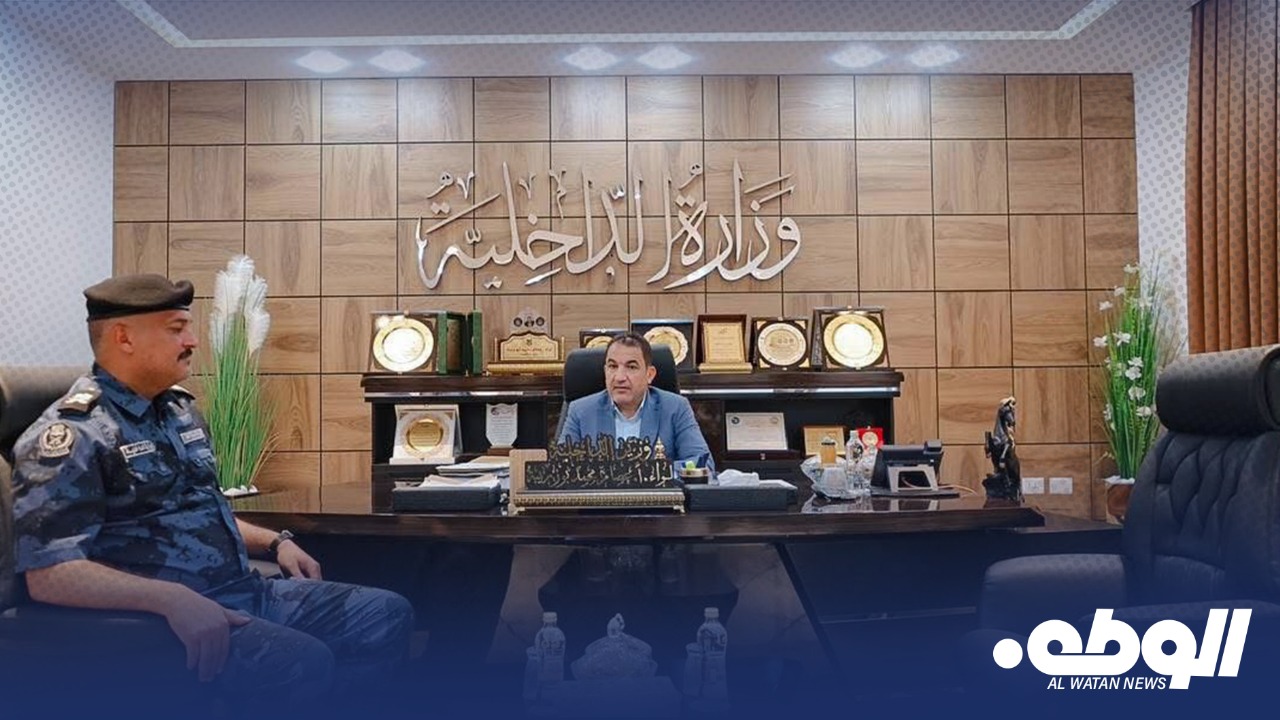 اجتمع وزير الداخلية اللواء عصام أبوزريبة اليوم الإثنين مع مدير الإدارة العامة للدعم المركزي اللواء خالد الفارسي لمتابعة سير العمل بالإدارة العامة للدعم المركزي، وتمركزاتها الأمنية في مختلف المناطق.