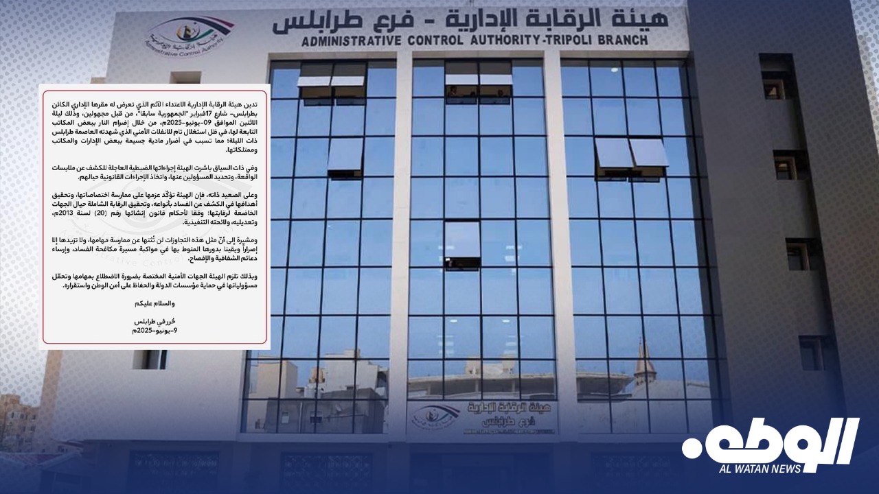 أدانت هيئة الرقابة الإدارية محاولة إحراق مبنى الهيئة في طرابلس من قبل مجهولين.