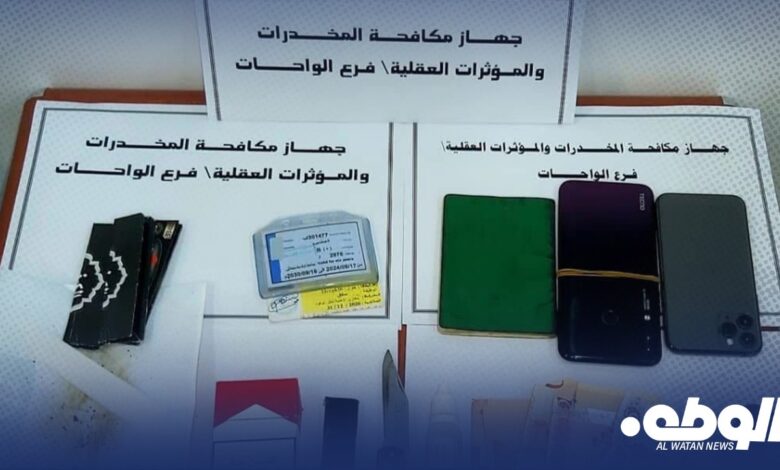 وقال الجهاز إنه أثناء التحقق من هويته ظهرت عليه علامات الارتباك، ما استدعى تفتيش السيارة احترازياً، حيث عُثر بداخلها على قطعة بنية اللون يُشتبه أنها مادة الحشيش، وسكين يُستخدم في التقطيع، إضافة إلى هاتفين نقالين، أوراق بافرة، علبة سجائر، جواز سفر، رخصة قيادة، تصريح نفطي، ومبلغ مالي بقيمة 70 دينارًا ليبيًا.
