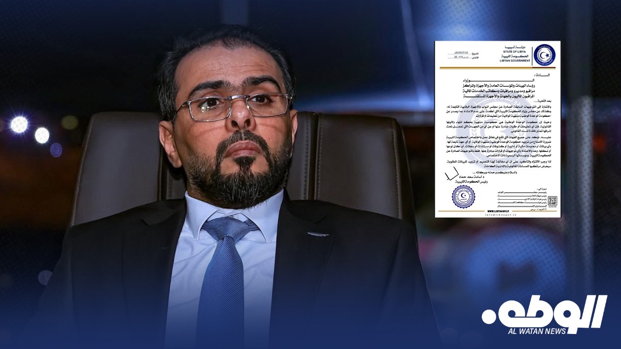 وشدد “حماد “على ضرورة الامتناع التام عن تزويد حكومة الدبيبة أو أي من مؤسساتها التابعة بأي معلومات أو بيانات مالية أو إدارية، أو سجلات أو مستندات، بغض النظر عن طبيعتها أو نظامها، مؤكدًا أن الالتزام ينحصر في التوجيهات الصادرة فقط عن الحكومة الليبية المعترف بها ومؤسساتها الرسمية ذات الصلة.