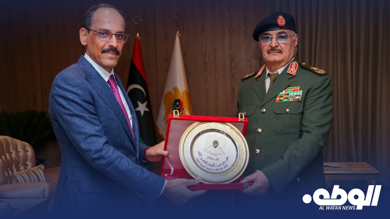 استقبل القائد العام للقوات المسلحة، المشير “خليفة حفتر”، اليوم في مكتبه بمقر القيادة العامة في الرجمة، رئيس جهاز المخابرات الوطني التركي، “إبراهيم كالين”.