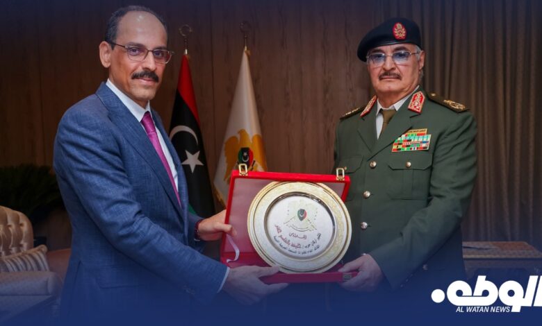 استقبل القائد العام للقوات المسلحة، المشير “خليفة حفتر”، اليوم في مكتبه بمقر القيادة العامة في الرجمة، رئيس جهاز المخابرات الوطني التركي، “إبراهيم كالين”.