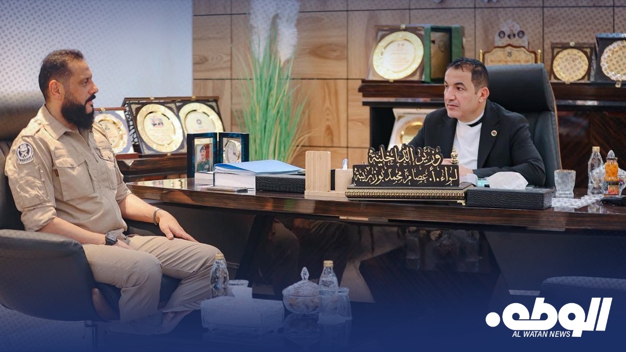 اجتمع وزير الداخلية اللواء “عصام أبوزريبة”، الأحد، مدير أمن بنغازي الكبرى، اللواء “صلاح هويدي”، حيث قدّم مدير الأمن شرحًا مفصلًا حول الأوضاع الأمنية داخل نطاق المديرية، والمهام التي قامت بها المراكز والأقسام التابعة لها منذ بداية العام الجاري في إطار مسؤولياتها لحماية المواطنين وحفظ النظام العام.