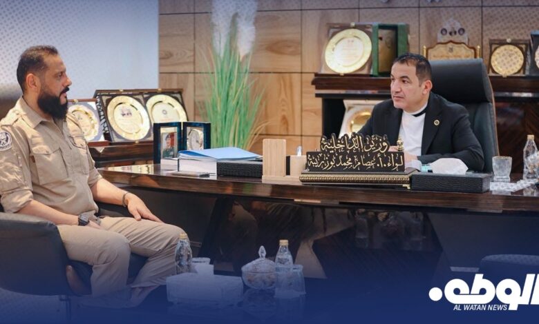 اجتمع وزير الداخلية اللواء “عصام أبوزريبة”، الأحد، مدير أمن بنغازي الكبرى، اللواء “صلاح هويدي”، حيث قدّم مدير الأمن شرحًا مفصلًا حول الأوضاع الأمنية داخل نطاق المديرية، والمهام التي قامت بها المراكز والأقسام التابعة لها منذ بداية العام الجاري في إطار مسؤولياتها لحماية المواطنين وحفظ النظام العام.