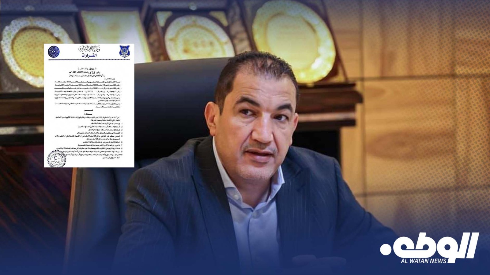 أصدر معالي وزير الداخلية، اللواء عصام أبوزريبة، القرار رقم (696) لسنة 2025م، القاضي بتحديد الأفعال المخلة بسمعة الشرطة، وذلك استناداً إلى المادة (109) من قانون هيئة الشرطة رقم (5) لسنة 2018م وتعديلاته.