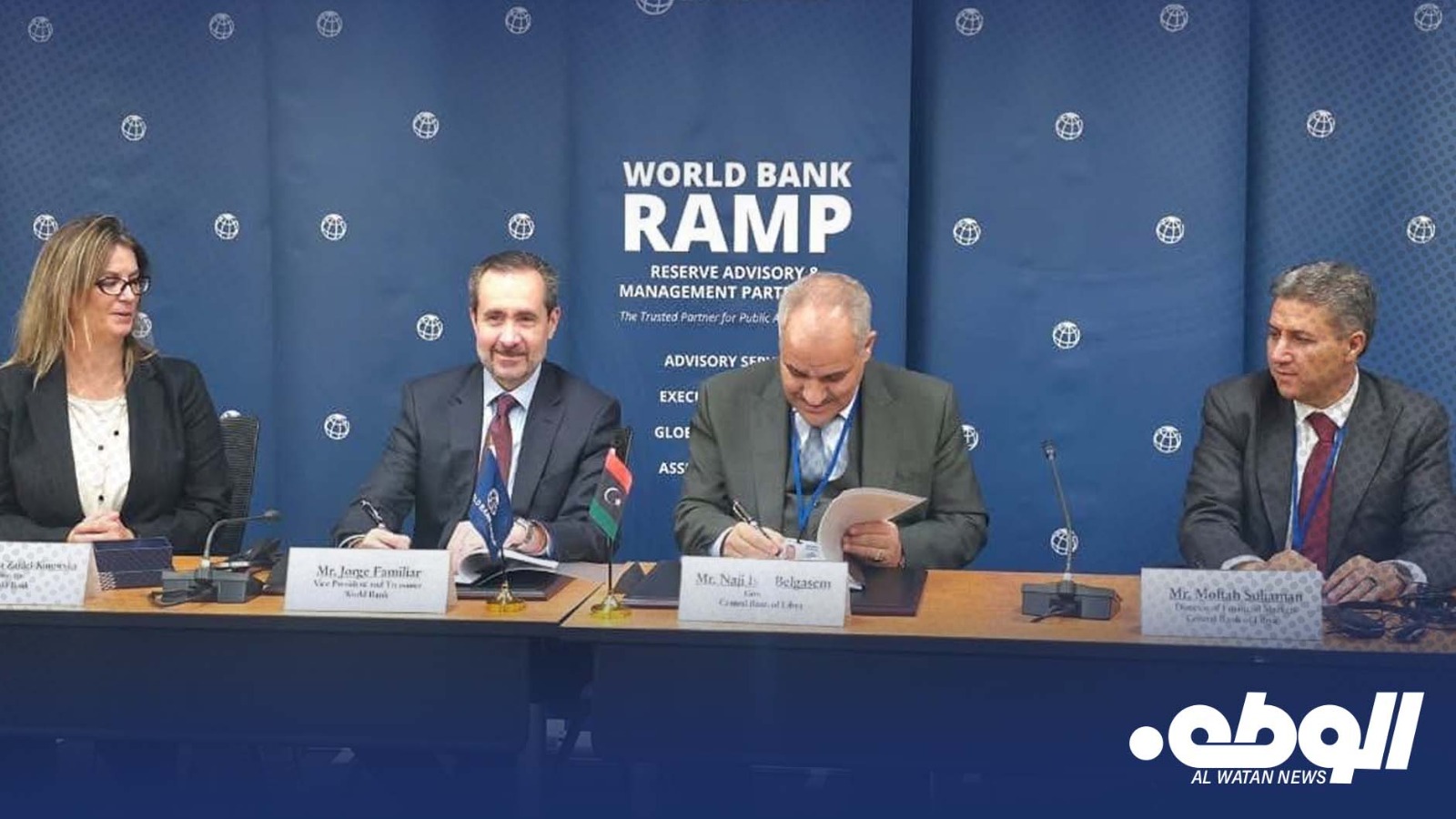 وقّع محافظ مصرف ليبيا المركزي ناجي محمد عيسى اتفاقية تعاون مع نائب رئيس الخزانة في البنك الدولي خورخيه فاميليار، ضمن برنامج إدارة الأصول والاحتياطيات العامة (RAMP).