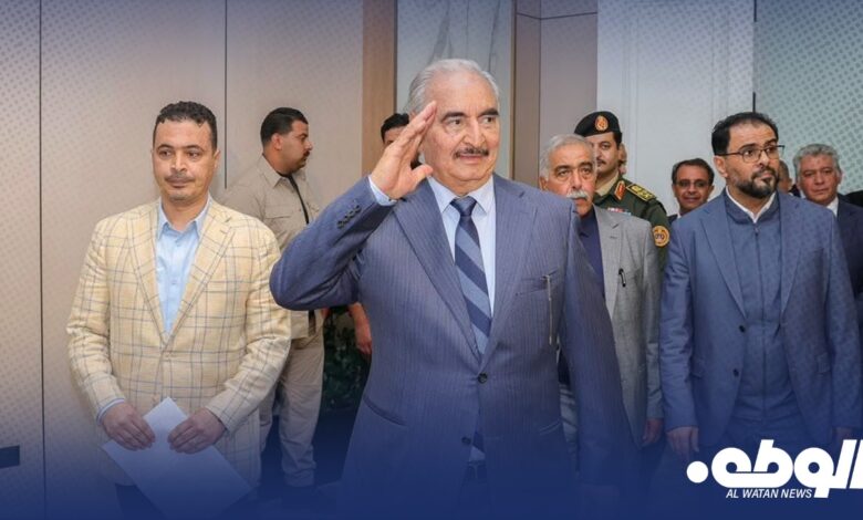 وشدد المشير حفتر على أن القوات المسلحة لا تتدخل في القرار السياسي، لكنها تقف دائماً إلى جانب الشعب الليبي في خياراته، وستضمن أي اتفاق يجمع الليبيين، مضيفاً أن كل من يحاول التصدي لإرادة الشعب سيجد نفسه في مواجهة القوات المسلحة