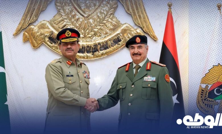 استقبل القائد العام للقوات المسلحة، المشير أركان حرب خليفة أبوالقاسم حفتر، بمقر القيادة العامة في بنغازي، قائد الجيش الباكستاني المشير عاصم منير، يرافقه وفد عسكري رفيع يضم عددًا من رؤساء أركانات الجيش الباكستاني، وذلك في إطار زيارة رسمية إلى ليبيا.