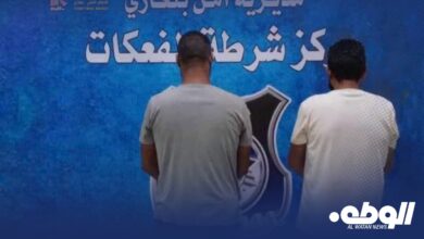 الوطن|متابعات ألقى مركز شرطة الفعكات التابع لمديرية أمن بنغازي القبض على شخصين من الجنسية المصرية قاما بسرقة أغراض من منزل…
